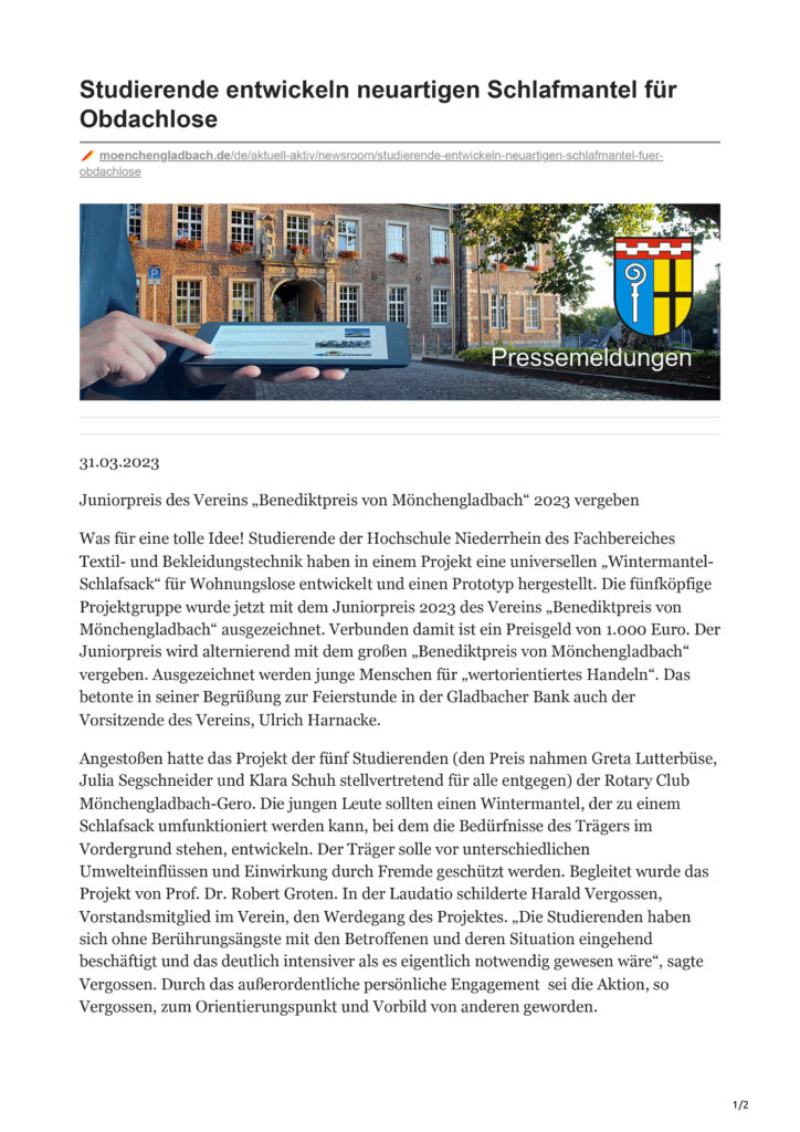 moenchengladbach.de: Studierende entwickeln neuartigen Schlafmantel für Obdachlose