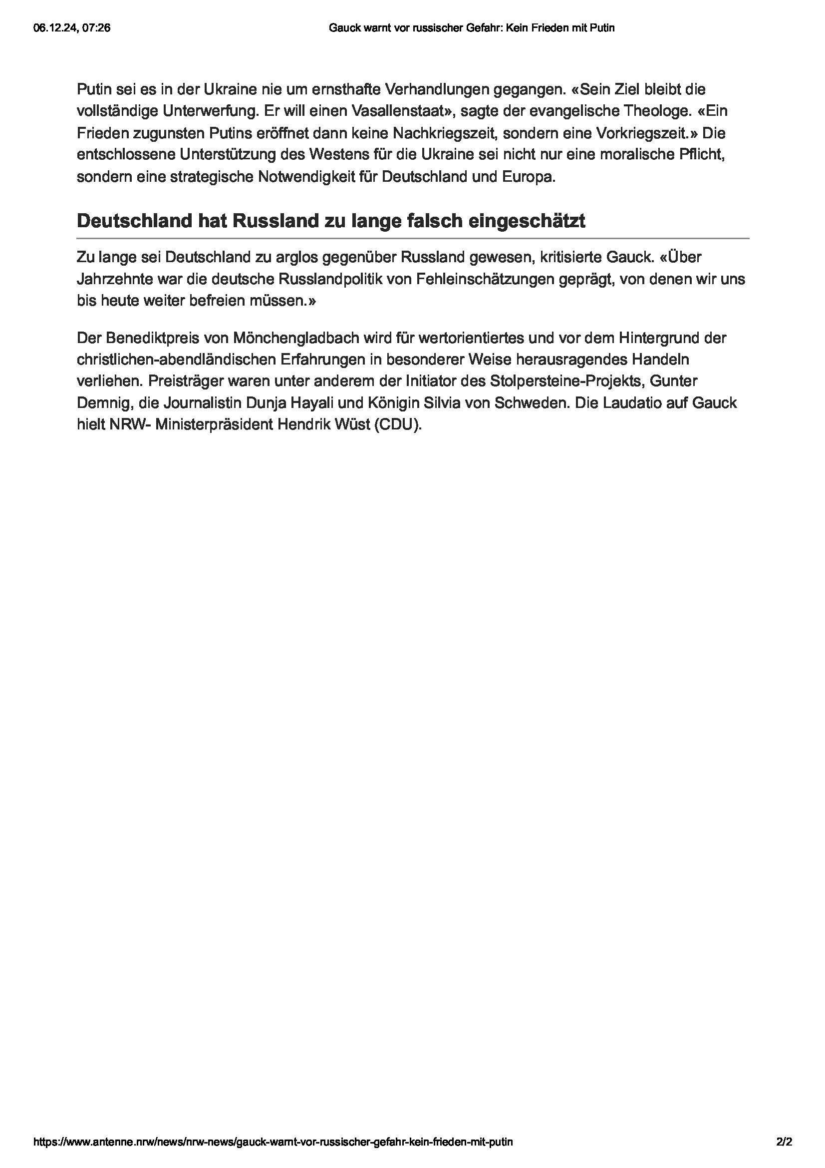 antenne.nrw – Gauck warnt vor russischer Gefahr: Kein Frieden mit Putin GSBX Media2024-12-22T19:41:04+02:0006. Dezember 2024| Ähnliche Beiträge Clipping: Die Stadt der Wohltaten Clipping: Die Stadt der Wohltaten Clipping: Rheinische Post Gesamtausgabe – Gladbacher Benediktpreis für Joachim Gauck Clipping: Rheinische Post Gesamtausgabe – Gladbacher Benediktpreis für Joachim Gauck Mönchengladbacher Stadtpost: ,,Mut ist eine menschliche Möglichkeit“ Mönchengladbacher Stadtpost: ,,Mut ist eine menschliche Möglichkeit“ Gauck erhält „Benediktpreis“ – und fordert Waffen für Ukraine – Nachrichten Gauck erhält „Benediktpreis“ – und fordert Waffen für Ukraine – Nachrichten radio901.de – Benediktpreis für Gauck radio901.de – Benediktpreis für Gauck